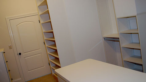 Master Bedroom Walk-In Closet: Custom-Built Wood Shelving, Dressing Room Counter