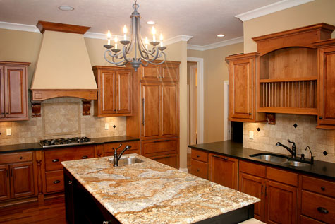 Madison Custom Homes Inc. builds custom homes with luxury kitchens in Central Indiana. This kitchen, custom-designed for the homeowner, features black granite countertops, a double sink, chandelier lighting, and an island with a natural granite counter and a utility sink.