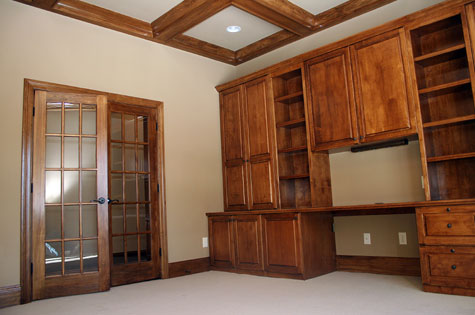 Madison Custom Homes Inc. builds custom luxury homes in Central Indiana. This home office features a hand-built oak desk and bookcase unit, pane glass double doors, wall-to-wall carpeting and wood ceil trim.