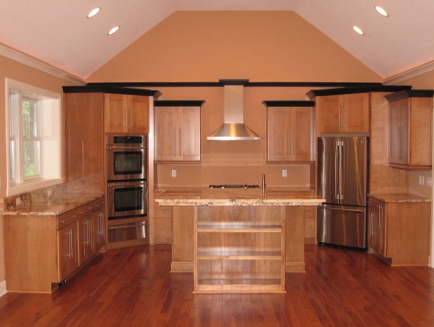 Luxury Home Kitchen: Hardwood Floors, Custom Cabinetry / Range Hood, Center Island w/ Sink & Display Shelving, Granite Countertops, Recessed Lighting – Madison Custom Homes Inc., Indianapolis, Indiana